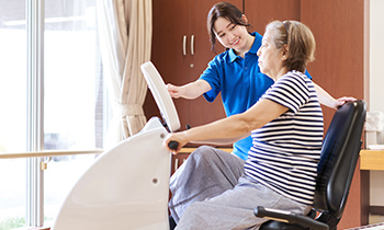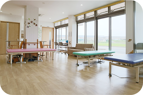 医師の指示のもと、理学療法士や作業療法士が、一人ひとりの身体の状態や目標に合わせた個別リハビリを行います。自立した生活を送れるよう、歩行訓練や関節の運動、日常動作の改善などを行い、身体機能の維持・向上を目指します。また、午後からは介護職員によるリズム体操・脳トレ体操、機能訓練などを実施し、楽しく安全に過ごせるよう配慮いたします。