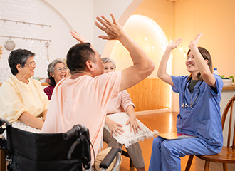 ご利用者さまの体調や状態に合わせて、運動やリハビリを行います。また、ほかのご利用者さまと一緒に楽しくレクリエーションを実施することもあります。