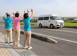 ケアプランが整いましたら、いよいよサービス開始です。ご利用当日は、専用車でご自宅までお迎えに伺い、健康チェックや入浴、食事、リハビリなどのサービスをご提供いたします。ご利用者さまが安心して過ごすことができ、ご家族さまのご負担が軽減できるよう、スタッフ一同心を込めて支援いたします。