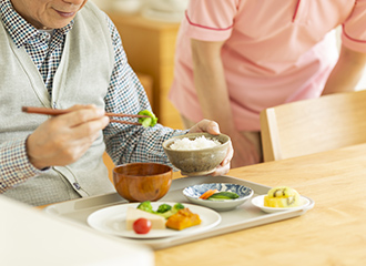 栄養バランスのとれたお食事を、施設内の厨房で調理しています。食後には口腔ケアの補助も行い、誤嚥予防や口内環境の維持にも配慮しています。おいしいごはんを楽しみながら、健康づくりをサポートします。